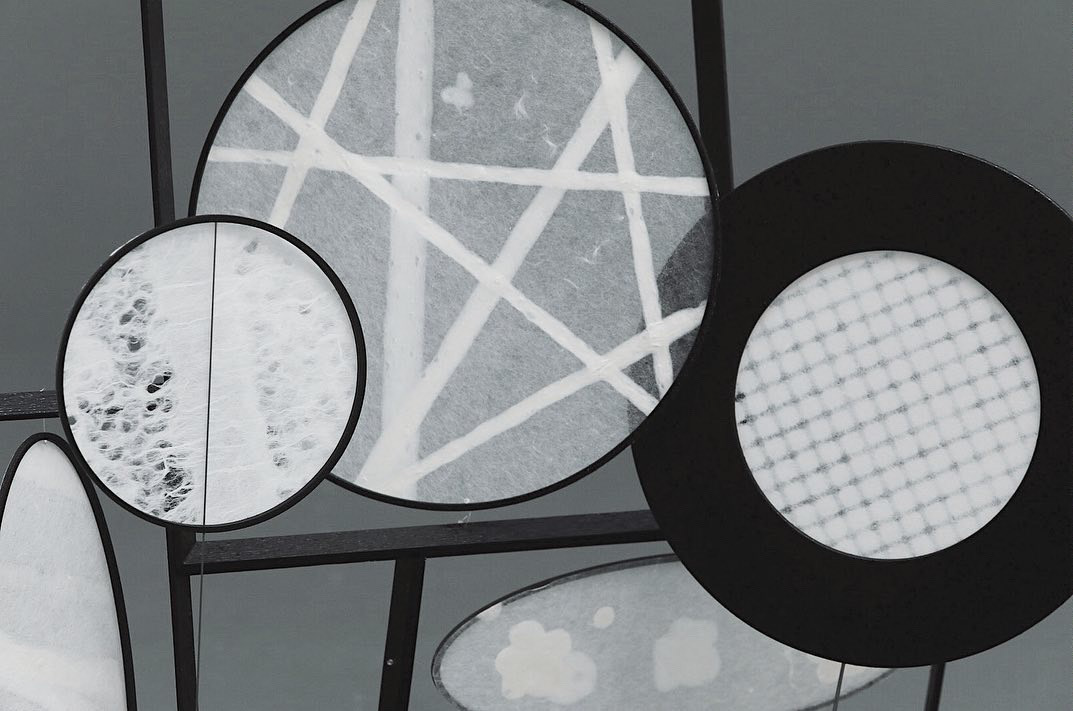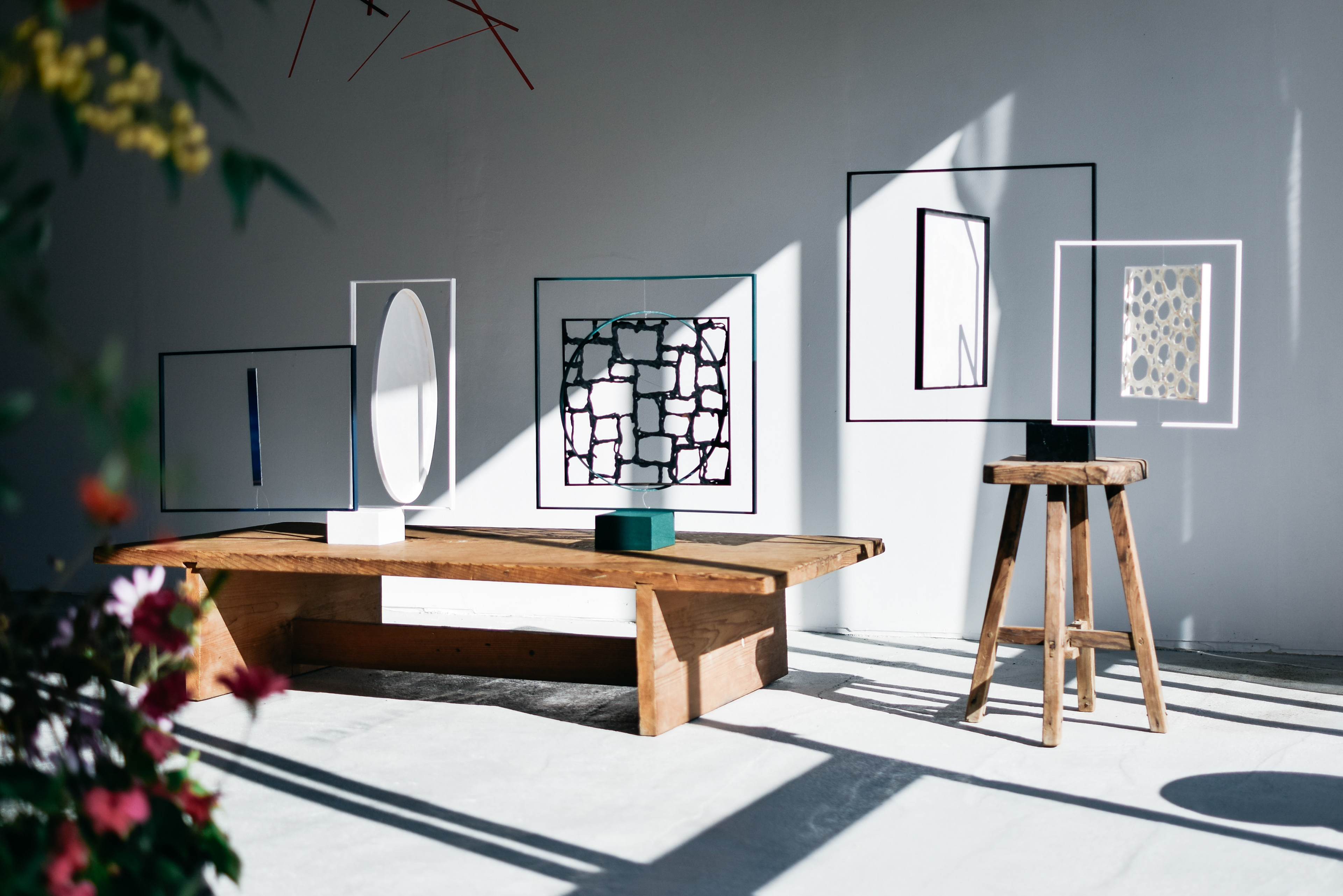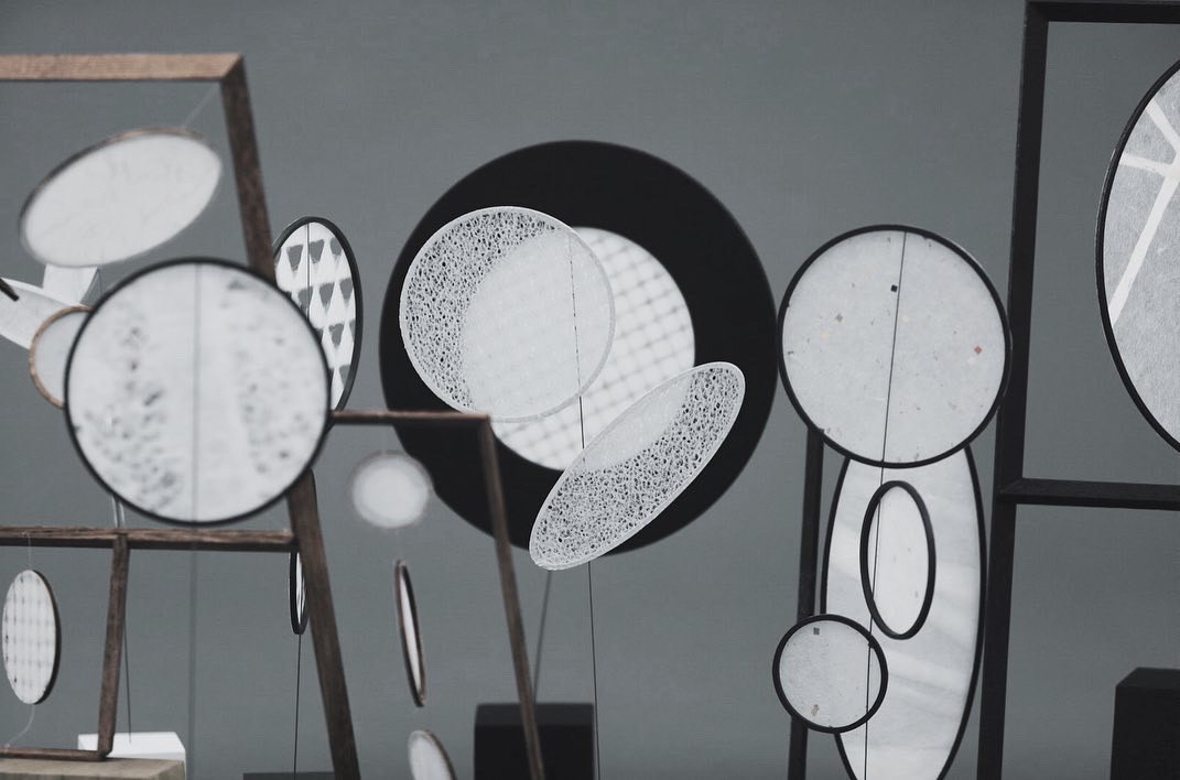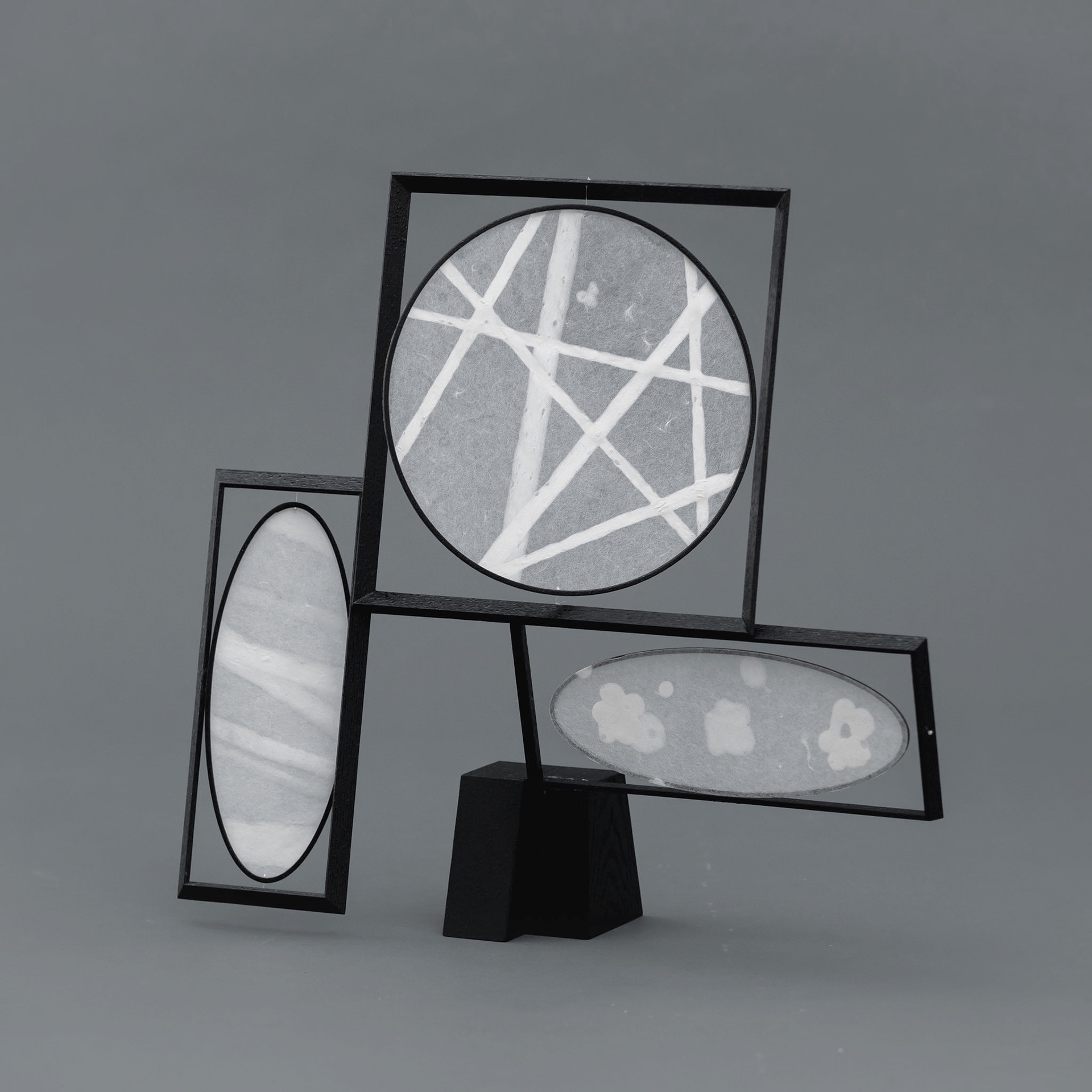 木枠に越前和紙を貼り付けたスタンドモビールのプロトタイピング。幾何学形態の構成と、アンバランスな造形のバランスを細かく試作。長田製紙所さんなどの個性的な越前和紙を中心に、木枠の形や色のバランスを細かく模索していく。