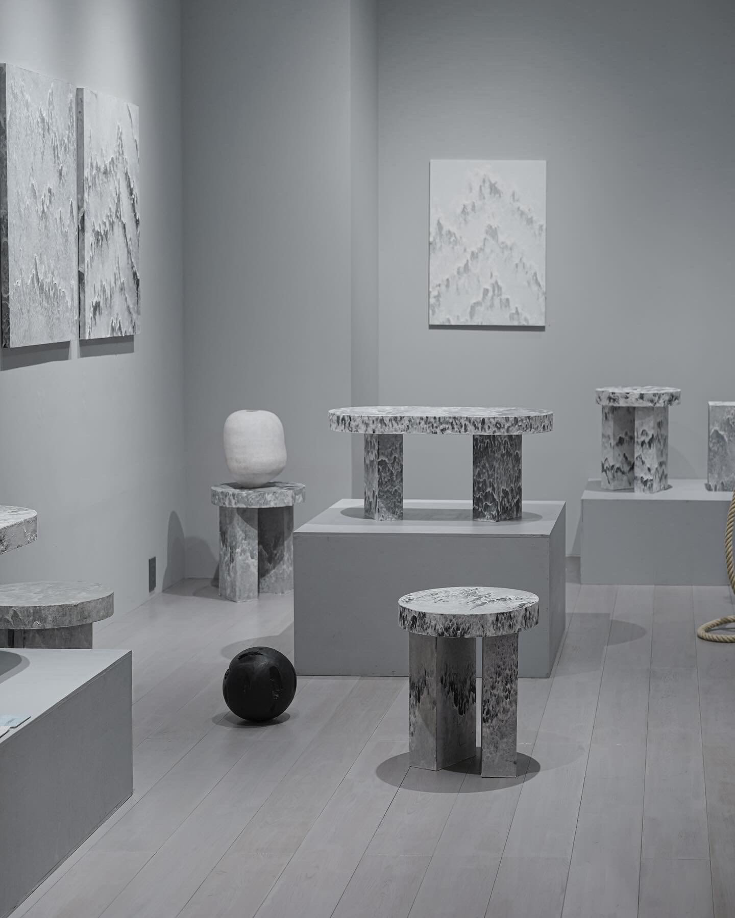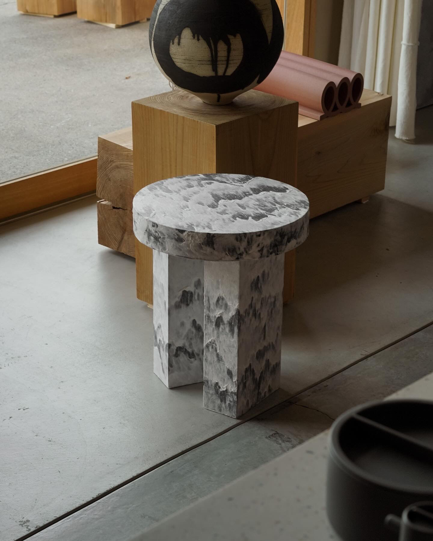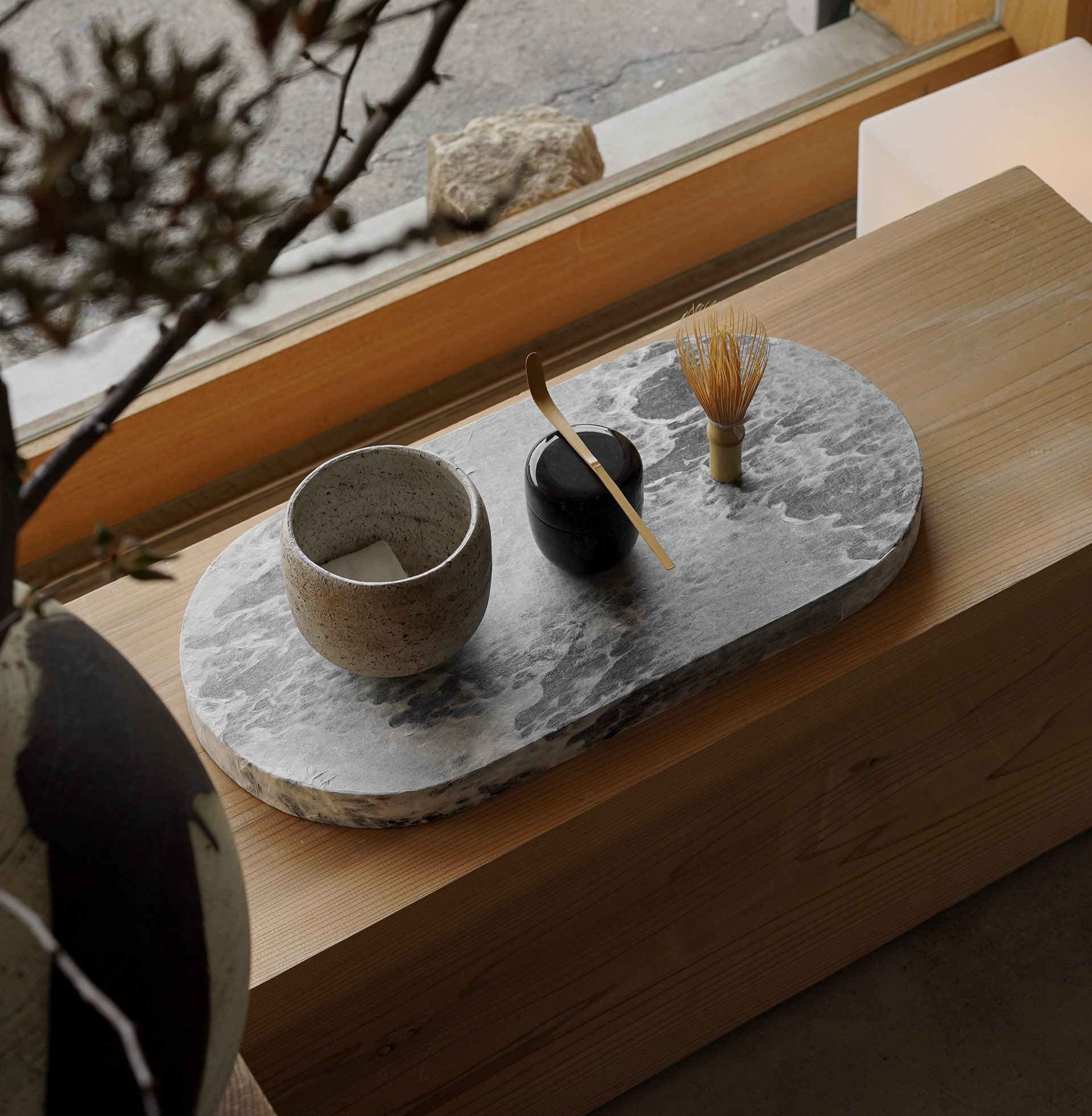 和紙を自然の中で何千年もの時間をかけて形成された石のように表現することで、私たちが自然物に対峙したときに感じる神秘的な感覚と、越前和紙の1500年という長い年月を紡いで現代に残されている尊さの感覚を重ね合わせています。この模様は漉いたばかりの柔らかい状態の和紙に水をかけることで作り出されており、水を使って作られている和紙という素材のストーリーをより強く表現しています。黒く塗装した木材に模様のある和紙を貼り付けることでテクスチャーを作りだしており。最後にウレタン塗装を施すことで、水に強く耐久性のあるオブジェクトに仕上げました。 By representing washi as a stone formed over thousands of years in nature, the work overlaps the sense of mystery we feel when we confront natural objects with the sense of preciousness that has been preserved in the present day through the weaving of Echizen washi over its long 1,500-year history. This pattern is created by pouring water on the soft, freshly made washi, and it further expresses the story of washi as a material that is made with water. The texture is created by pasting patterned washi onto black painted wood. Finally, a urethane coating is applied to create a water-resistant and durable object.